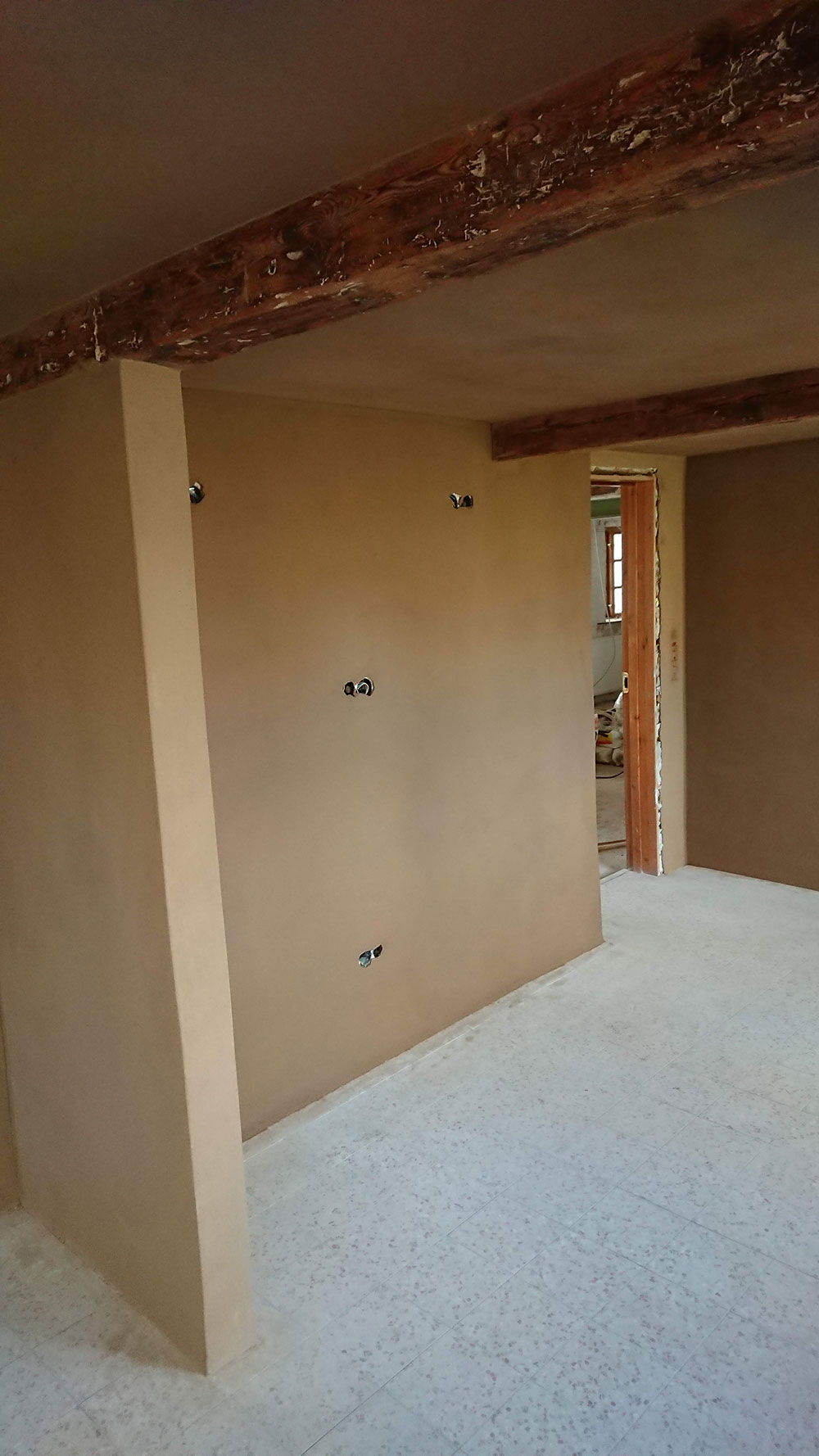 EITEMPERAFARBE AUF LEHMPUTZ, DER HELLE FARBTON IST EINE KALK-KASEINFARBE